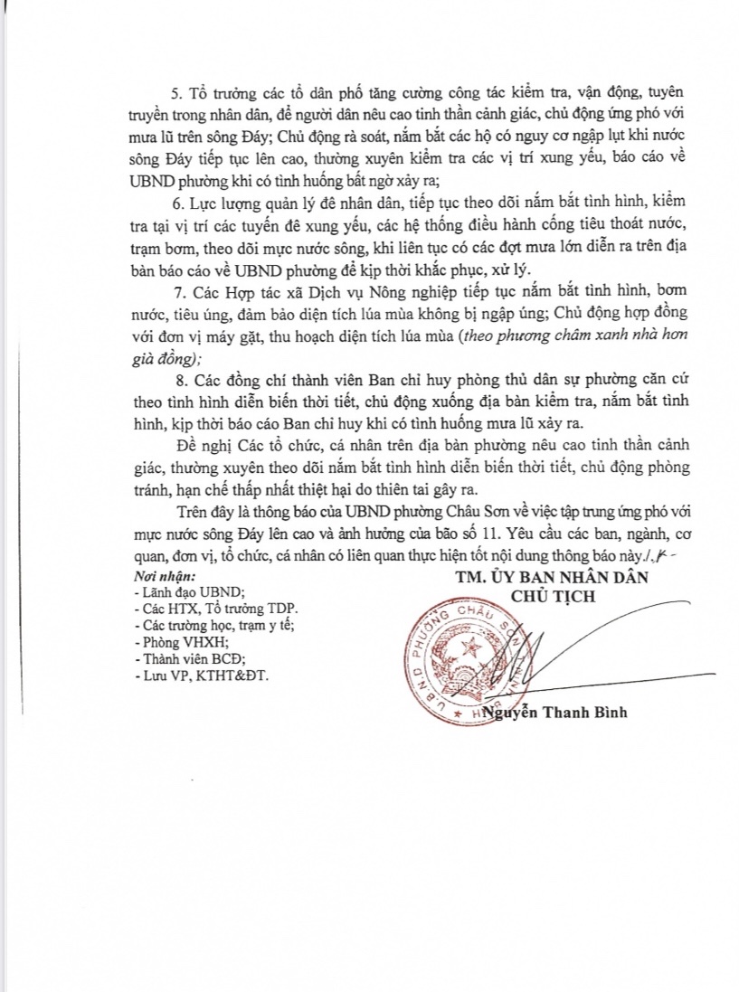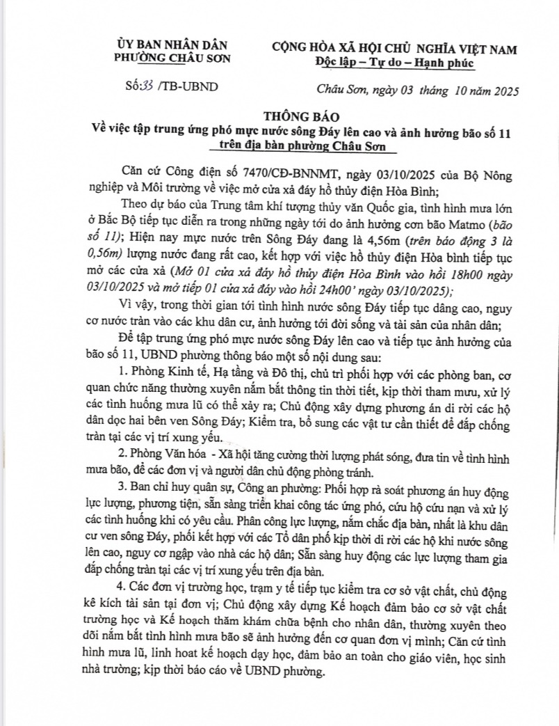 Thông báo về việc tập trung ứng phó mực nước sông đáy lên cao và ảnh hưởng bão số mười một trên địa bàn phường Châu sơn