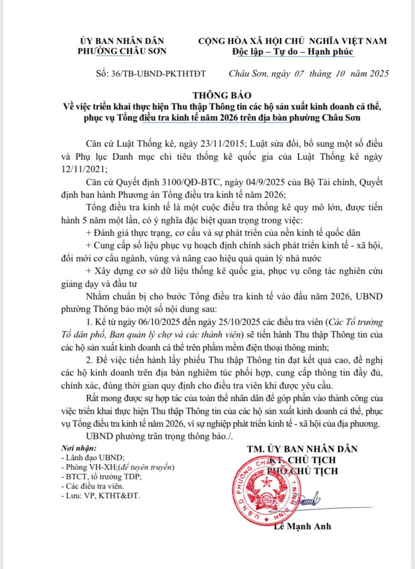Ủy ban nhân dân phường Châu Sơn thông báo về việc triển khai thực hiện thu thập thông tin các hộ sản xuất kinh doanh cá thể phục vụ tổng điều tra kinh tế năm 2026 trên địa bàn phường